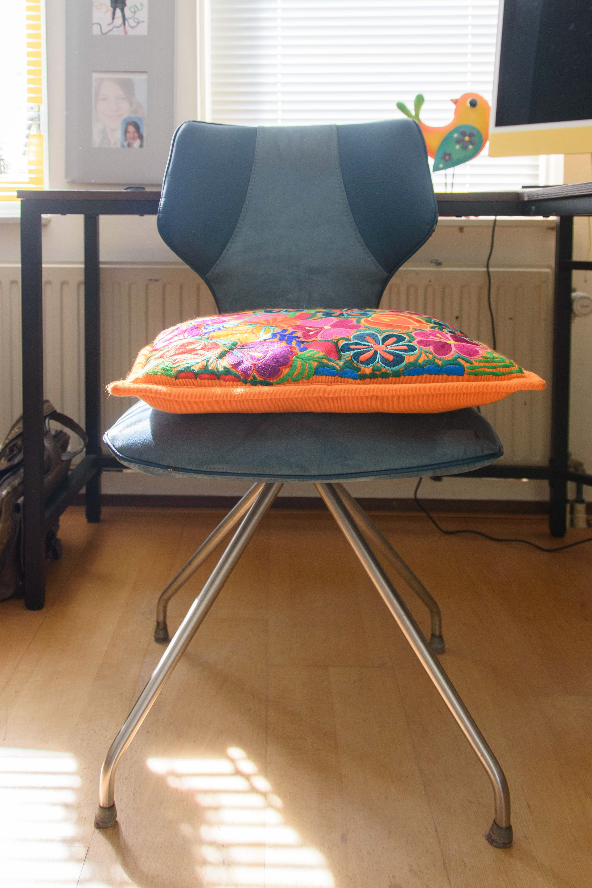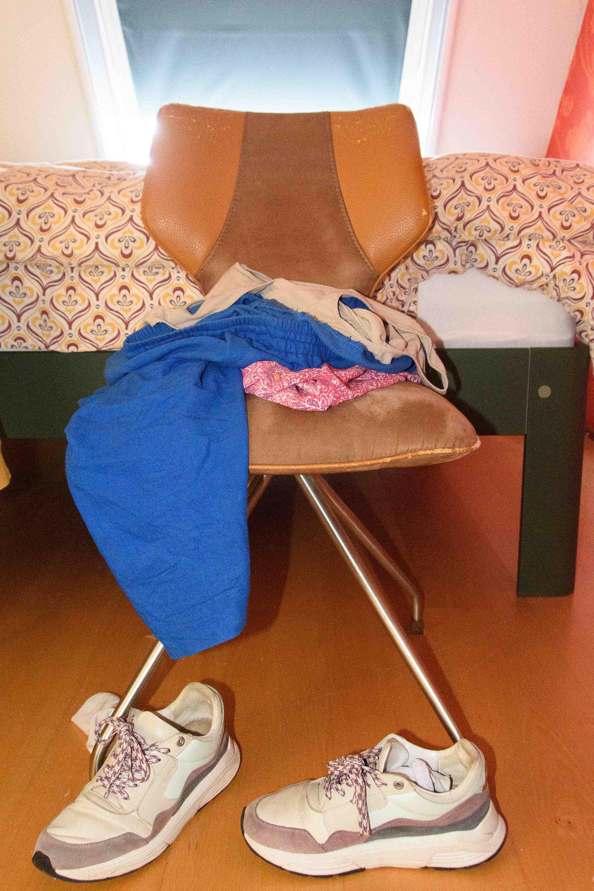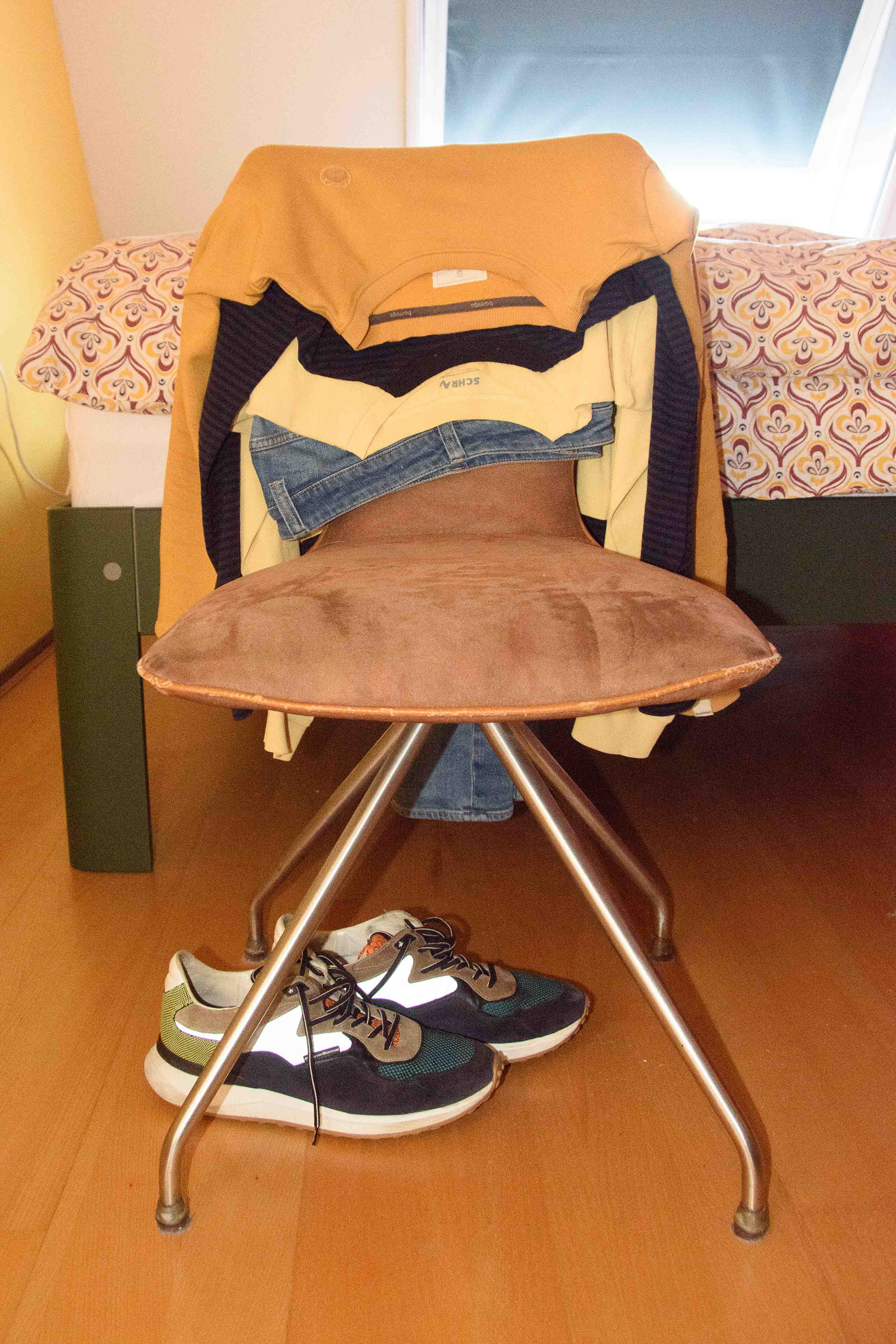 Dit is mijn trieste laatste levensfase als voormalig moderne en kleurrijke stoel aan de eettafel.